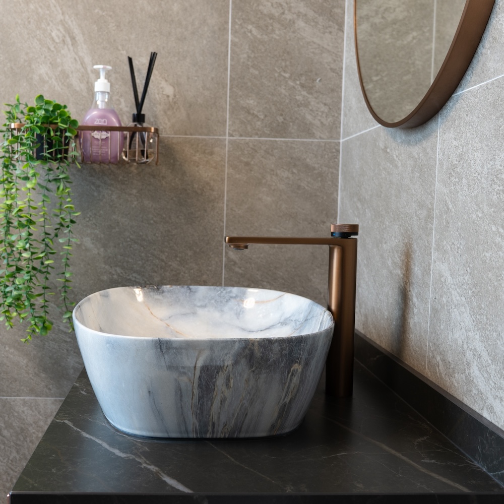 This bathroom features Mysa Saint Lorenzo, a bold and elegant stone with deep veining and a moody, marble-like presence. Used for the vanity countertop and vessel sink, it introduces a luxurious contrast to the surrounding soft grey tiles. Paired with warm metallic accents and clean lines, the stone adds a sense of modern sophistication and quiet drama to this compact yet refined space.