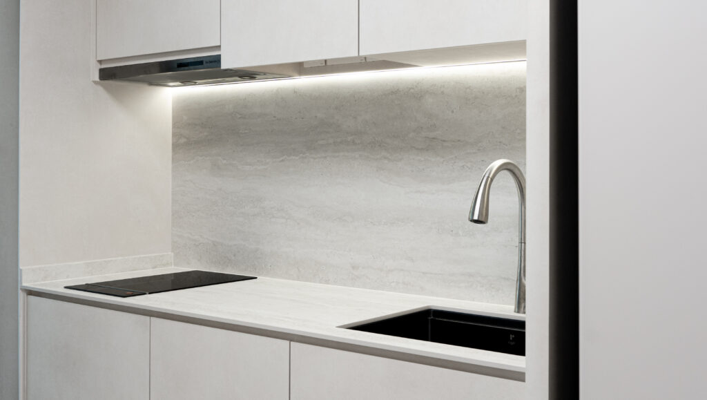 The kitchen features Mysa Crème Travertino, a stone that perfectly complements the essence of Wabi-Sabi minimalism. It’s soft beige undertones and naturally layered texture bring warmth and quiet sophistication to the space. The subtle movement within the stone mirrors the philosophy of imperfection and impermanence.